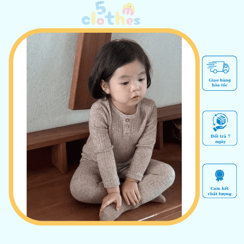 Bộ quần áo dài tay tăm thường gồm áo dài tay dáng ôm vừa phải và quần dài lưng thun co giãn. Phần cổ áo có thể là cổ tròn hoặc cổ tim, bo nhẹ để giữ ấm phần cổ cho bé mà vẫn dễ mặc vào – cởi ra. Tay áo và ống quần có bo chun nhẹ giúp chắn gió lạnh, giữ ấm tốt hơn mà không gây hằn da hay khó chịu khi bé vận động.